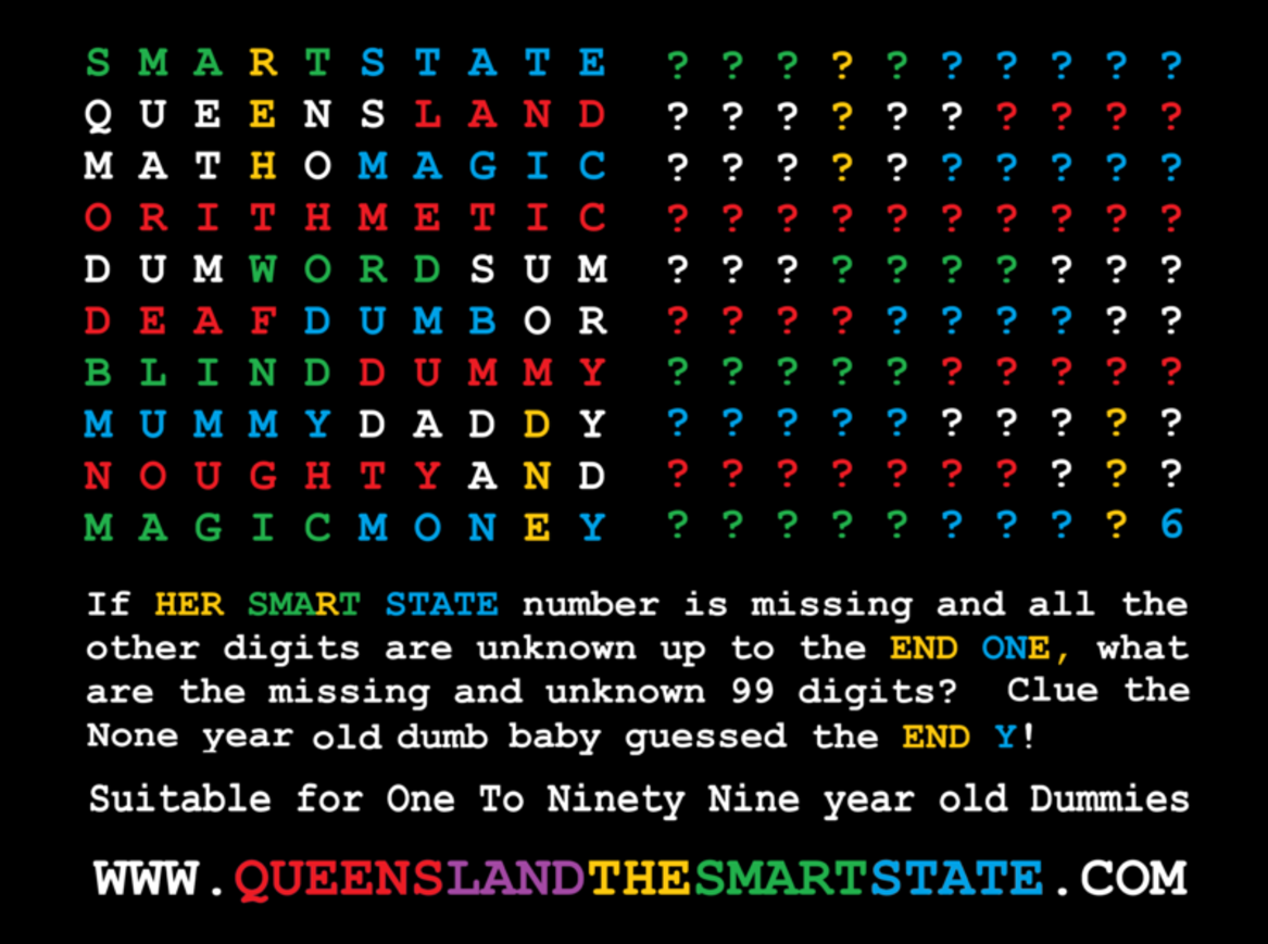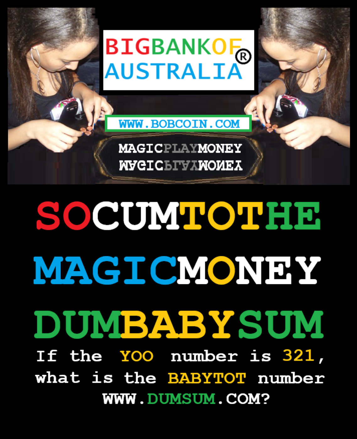 Fair Dinkum! Mrs Noughtfear succeeded in registering the trademark Big Bank of Australia in relation to magic play money! And has taken over www.bobcoin.com and www.bubcoin.com and psychicmoney.com She is giving away her secret ways of baffling AI with her 100 digit Dum Sums which can be jumbled and easily unjumbled!